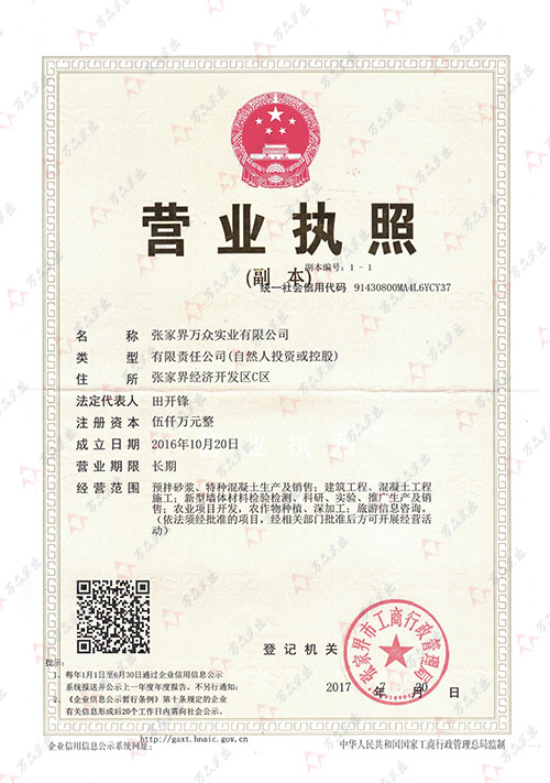 張家界萬眾實(shí)業(yè)有限公司營業(yè)執(zhí)照